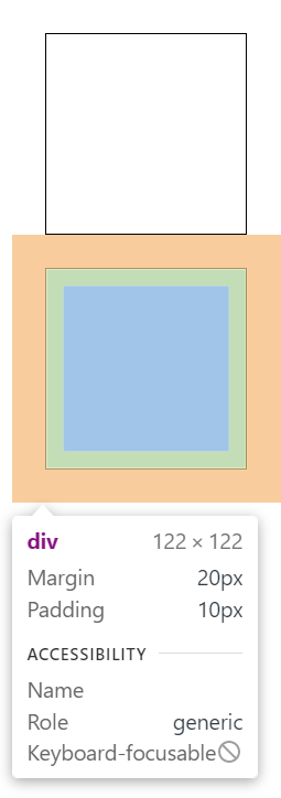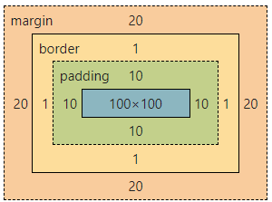 위의 코드처럼 content자체의 크기는 100*100이지만 1px크기의 border와의 내부여백 10px, border를 기준으로 한 외부여백이 20px로 적용된 것을 확인할 수 있습니다.